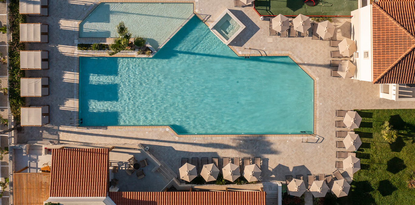 The Aegean Houses Hotel large outdoor pool of 220m2 with fresh, crystal clear water is perfect for endless swimming, cooling yourself off from the hot rays of the summer sun.